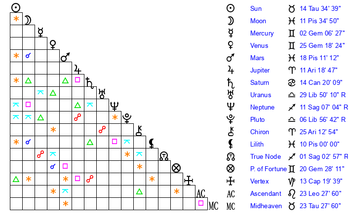 | Moon | 11 Pisces 28 | 28 Leo 42 | 14 Capricorn 23 |