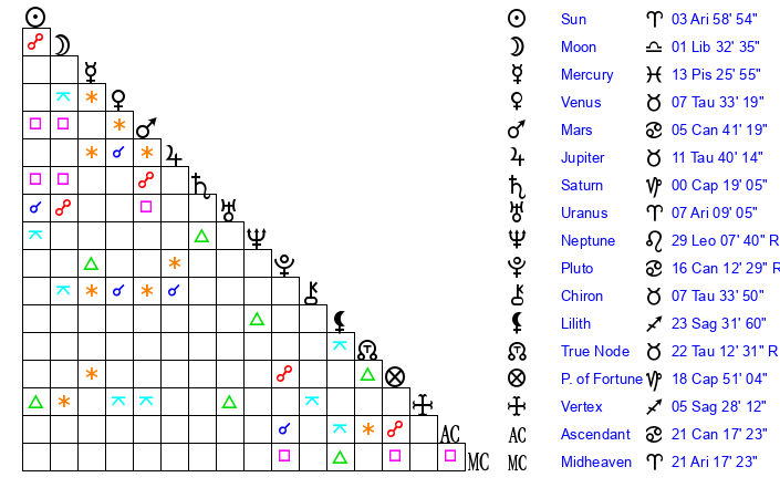 | Sun | 3 Aries 59 | 4 Aries 43 | 6 Cancer 53 |