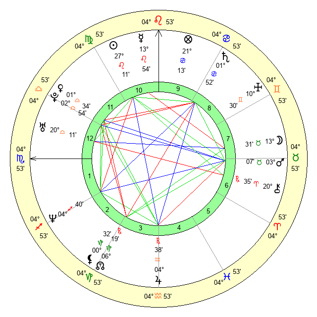 | Mercury | 13 Leo 54 | 9 Leo 5 | 11 Scorpio 22 |