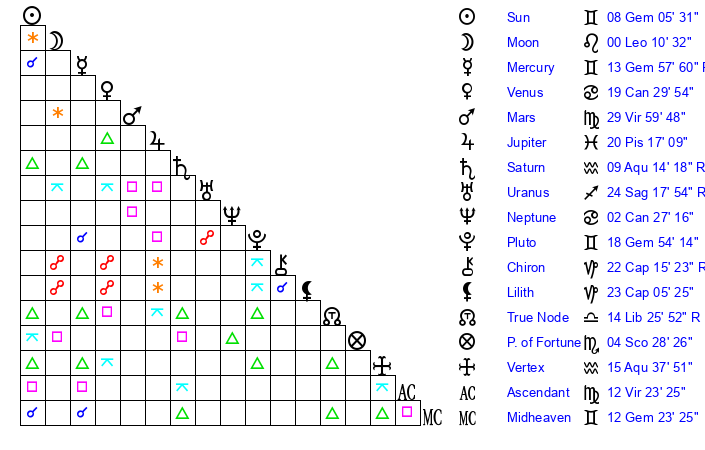 | Mercury | 13 Gemini 57 | 10 Gemini 12 | 13 Libra 33 |