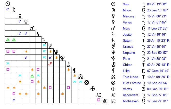 | Moon | 23 Leo 17 | 2 Virgo 20 | 22 Virgo 58 |