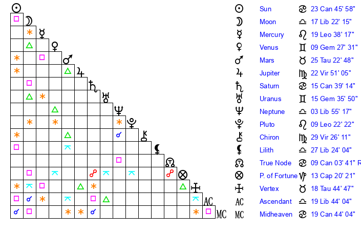 | Moon | 17 Libra 28 | 7 Aries 7 | 24 Virgo 12 |