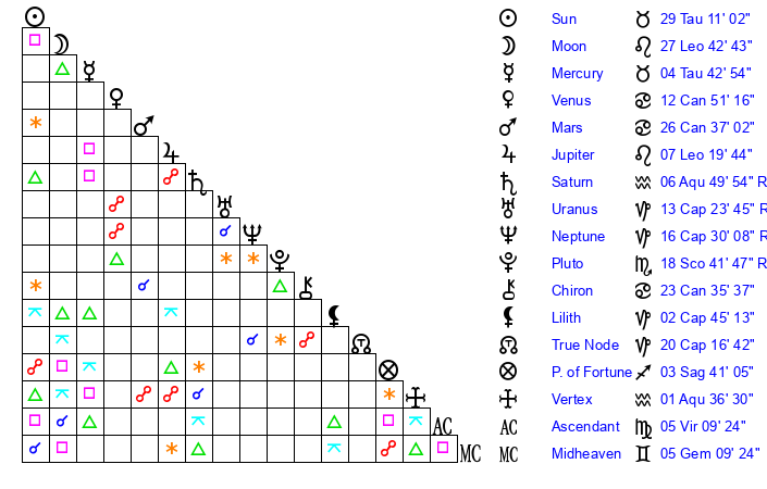 | Moon | 27 Leo 47 | 2 Pisces 27 | 24 Scorpio 18 |