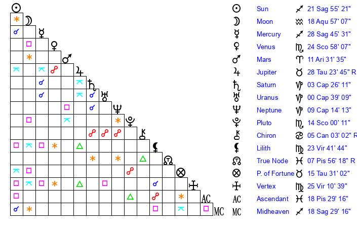 | Mars | 11 Aries 32 | 28 Sagittarius 47 | 0 Taurus 12 |