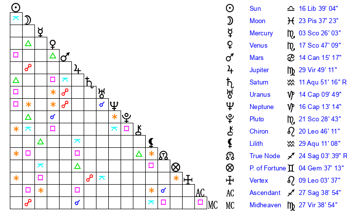 | Sun | 16 Libra 39 | 16 Libra 39 | 19 Scorpio 33 |