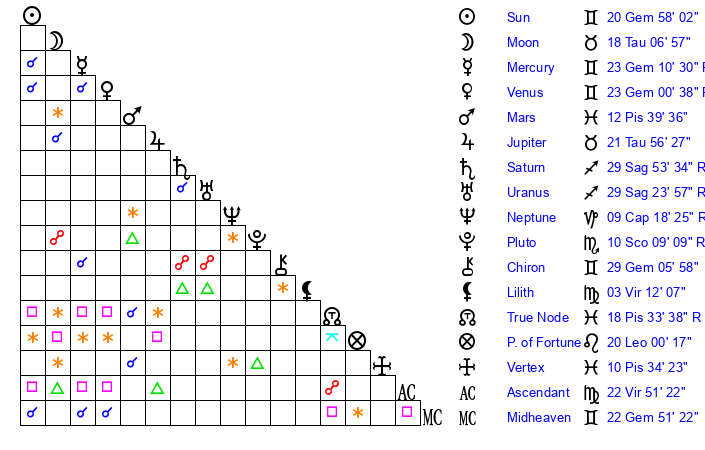 | Moon | 18 Taurus 0 | 25 Sagittarius 28 | 18 Virgo 59 |