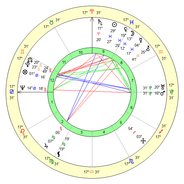 | Moon | 13 Pisces 20 | 10 Sagittarius 10 | 18 Gemini 9 |