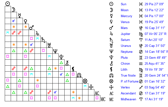 | Moon | 13 Pisces 20 | 10 Sagittarius 10 | 18 Gemini 9 |