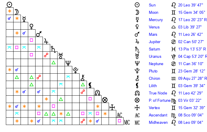 | Sun | 20 Leo 40 | 21 Leo 51 | 18 Sagittarius 27 |