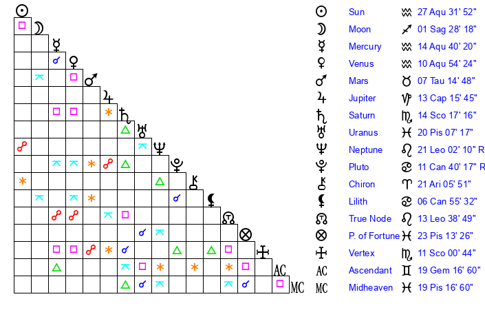 Sun | 27 Aquarius 32 | 28 Aquarius 16 | 5 Gemini 52 |