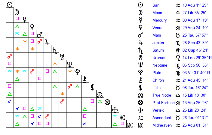 Moon | 27 Libra 32 | 28 Aquarius 12 | 1 Aries 35 |