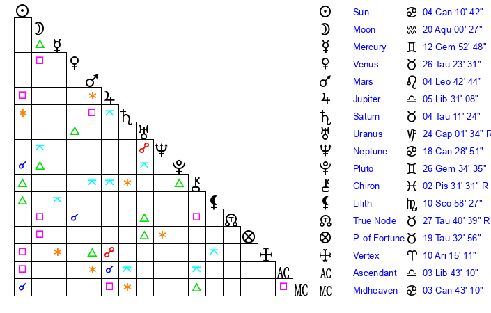 | Moon | 20 Aquarius 2 | 22 Cancer 20 | 10 Taurus 49 |