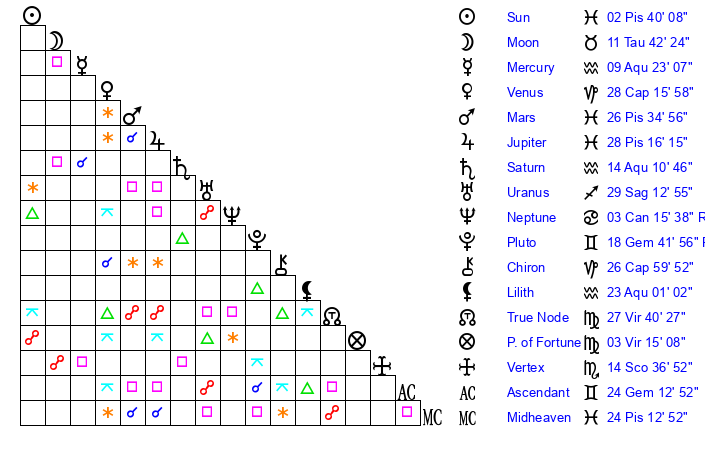 | Sun | 2 Pisces 40 | 4 Pisces 19 | 0 Cancer 48 |