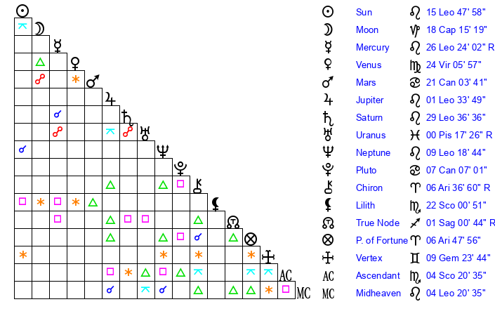 Mercury | 26 Leo 23 | 4 Leo 26 | 18 Sagittarius 0 |