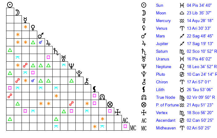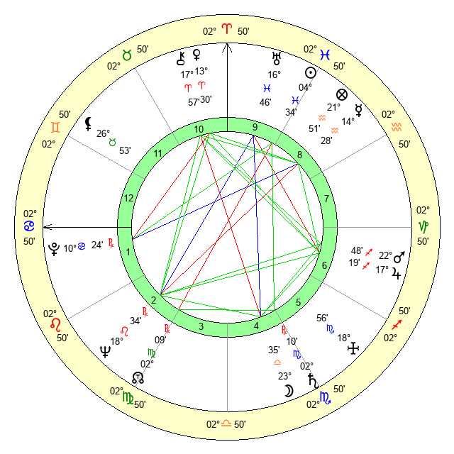 Venus | 13 Aries 30 | 10 Aries 14 | 16 Cancer 59 |