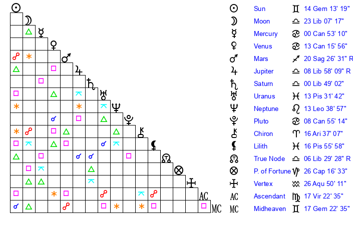 Moon | 23 Libra 10 | 13 Libra 34 | 21 Cancer 14 |