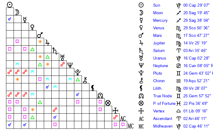 | Sun | 0 Capricorn 29 | 1 Capricorn 21 | 27 Aries 2 |