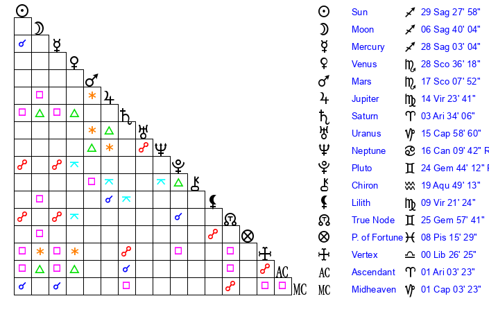 | Mercury | 28 Sagittarius 4 | 8 Sagittarius 48 | 20 Aries 14 |