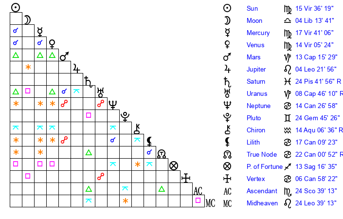 | Venus | 14 Virgo 6 | 17 Leo 45 | 11 Aquarius 18 |