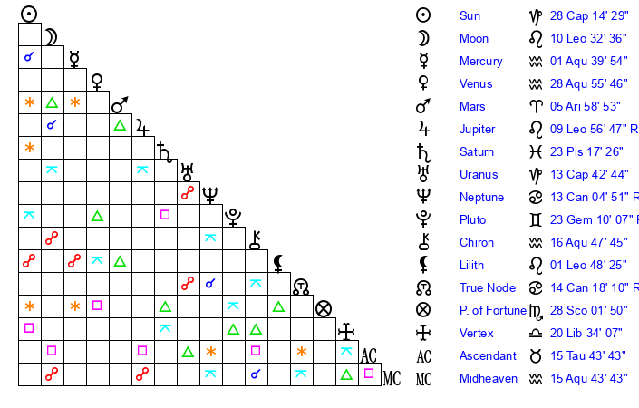 | Sun | 28 Capricorn 15 | 29 Capricorn 52 | 24 Taurus 26 |