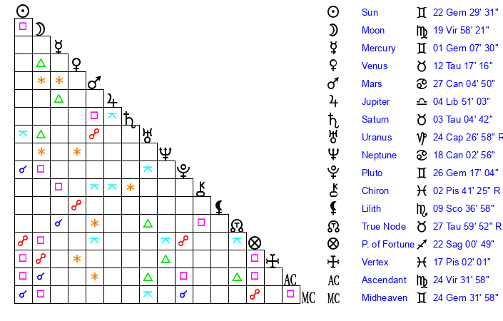 | Sun | 22 Gemini 29 | 23 Gemini 39 | 13 Libra 18 |