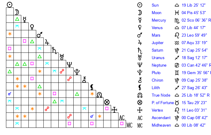 | Sun | 19 Libra 25 | 20 Libra 36 | 23 Aquarius 50 |