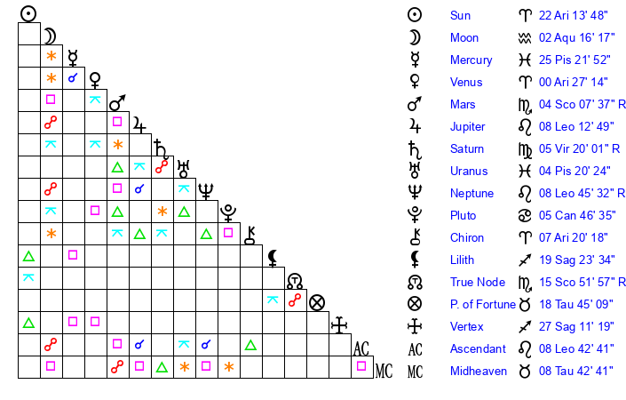 Sun | 22 Aries 14 | 22 Aries 47 | 3 Leo 7 |