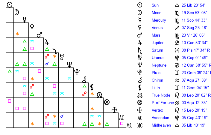 | Sun | 25 Libra 24 | 26 Libra 34 | 25 Aquarius 53 |