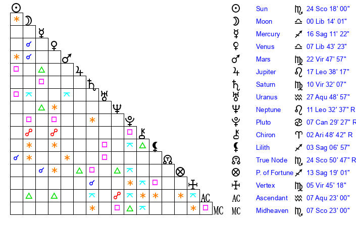 Sun | 24 Scorpio 18 | 25 Scorpio 50 | 10 Pisces 49 |