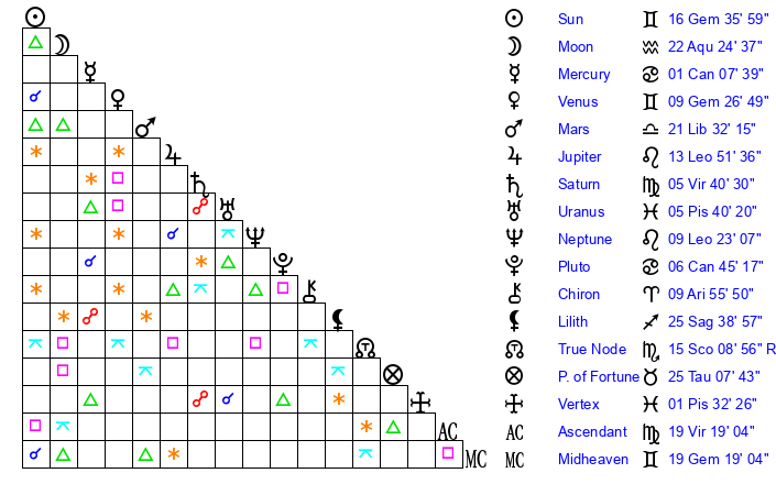 Moon | 22 Aquarius 16 | 7 Scorpio 9 | 2 Capricorn 58 |