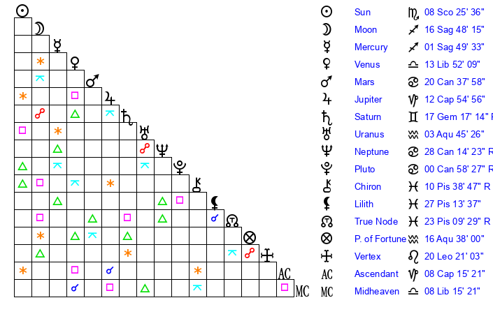 | Sun | 8 Scorpio 25 | 9 Scorpio 31 | 0 Pisces 59 |