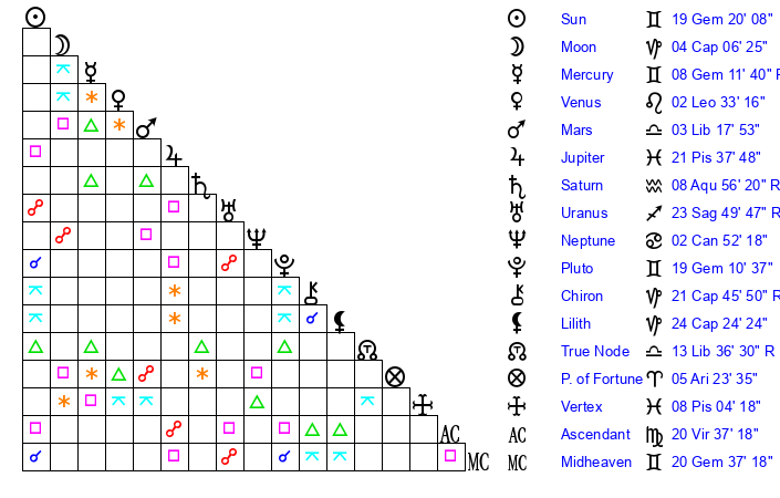 | Pluto | 19 Gemini 11 | 3 Aquarius 29 | 20 Gemini 38 |