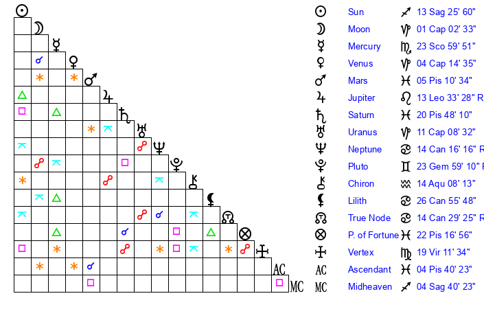 | Neptune | 14 Cancer 16 | 27 Pisces 7 | 12 Cancer 6 |