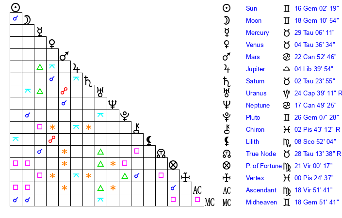 | Sun | 16 Gemini 2 | 17 Gemini 12 | 6 Libra 39 |