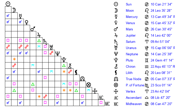 | Mercury | 13 Cancer 49 | 6 Leo 56 | 6 Scorpio 6 |