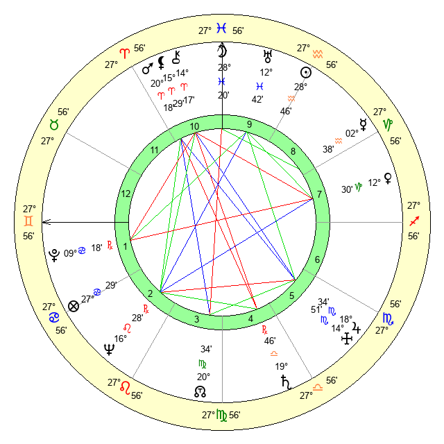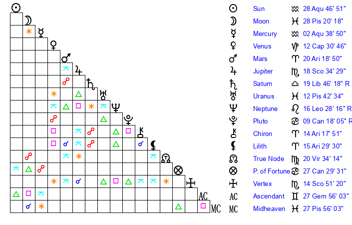 Sun | 28 Aquarius 47 | 0 Pisces 2 | 8 Gemini 58 |