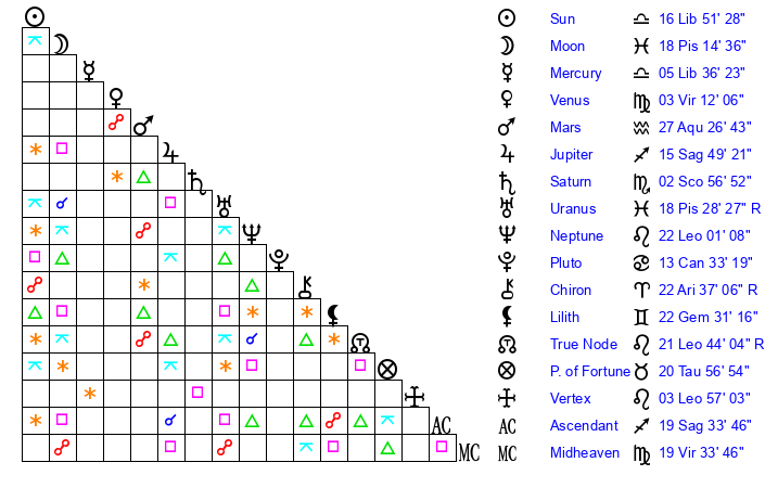 Sun | 16 Libra 52 | 17 Libra 24 | 28 Capricorn 53 |