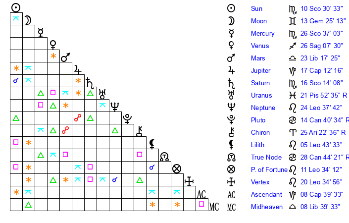 Saturn | 16 Scorpio 43 | 12 Pisces 45 | 26 Scorpio 4 |