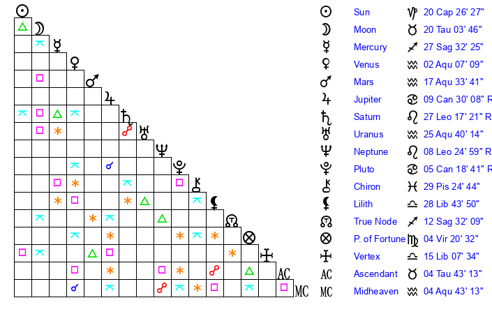 Sun | 20 Capricorn 26 | 21 Capricorn 44 | 6 Taurus 22 |