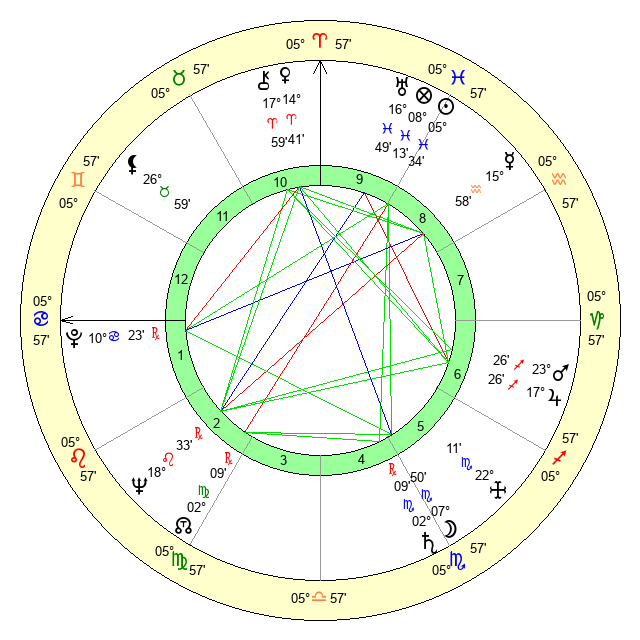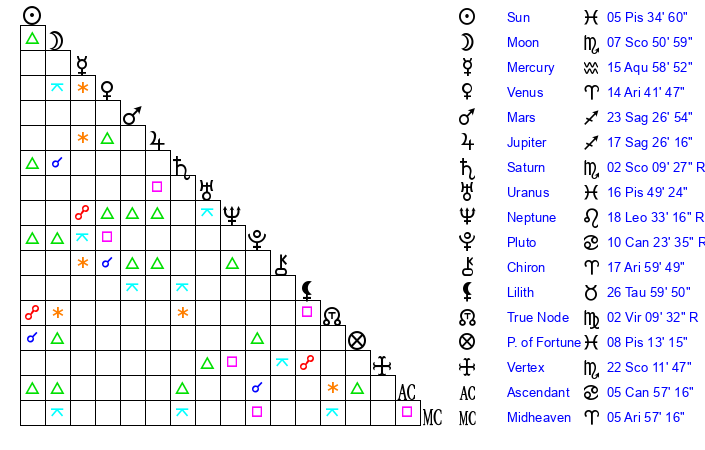 Sun | 5 Pisces 35 | 7 Pisces 5 | 14 Gemini 29 |