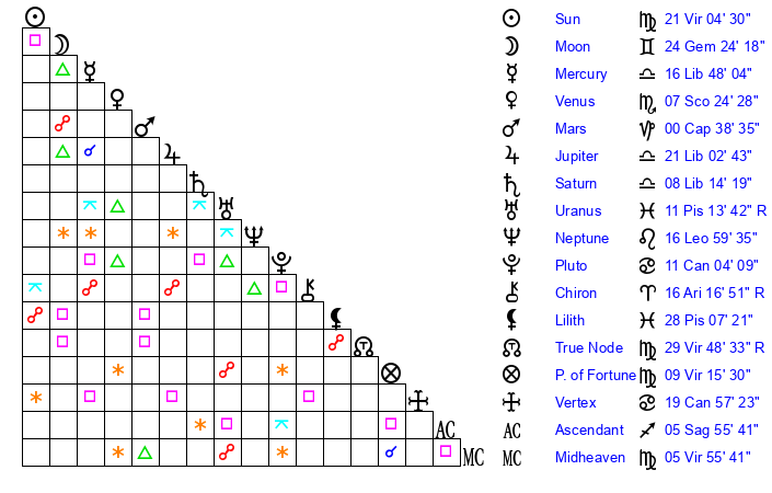 Saturn | 8 Libra 50 | 28 Pisces 53 | 19 Libra 43 |