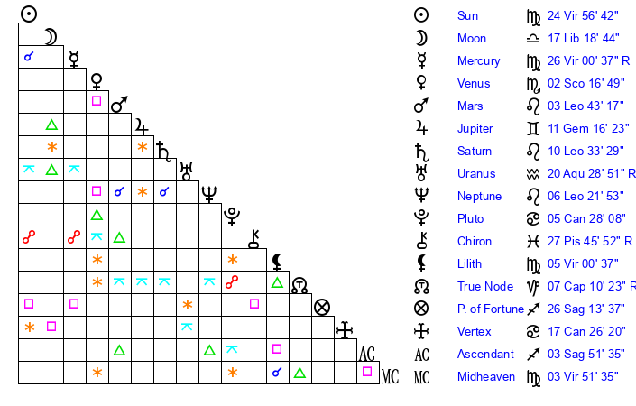 | Sun | 24 Virgo 56 | 25 Virgo 47 | 13 Capricorn 18 |
