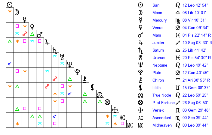 Moon | 8 Libra 12 | 26 Sagittarius 49 | 24 Gemini 8 |