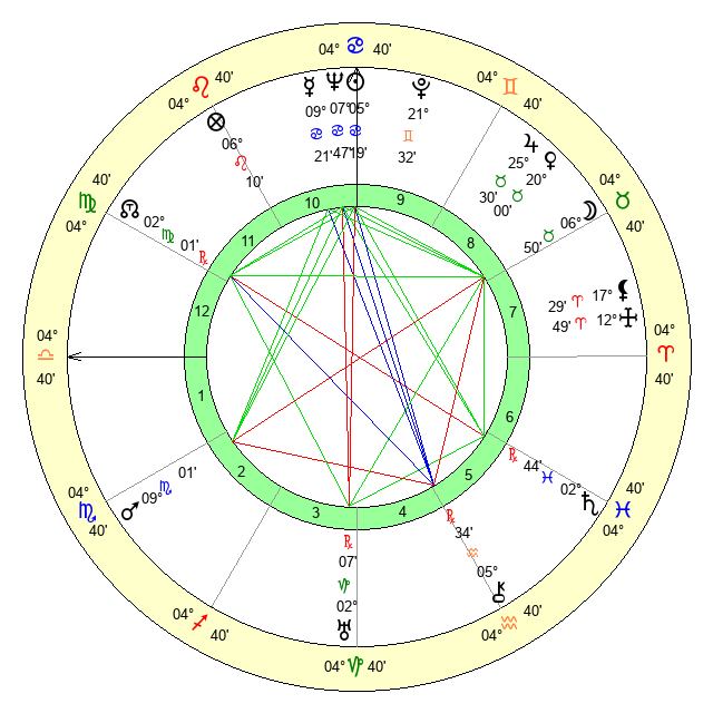 | Sun | 5 Cancer 20 | 6 Cancer 18 | 1 Scorpio 37 |