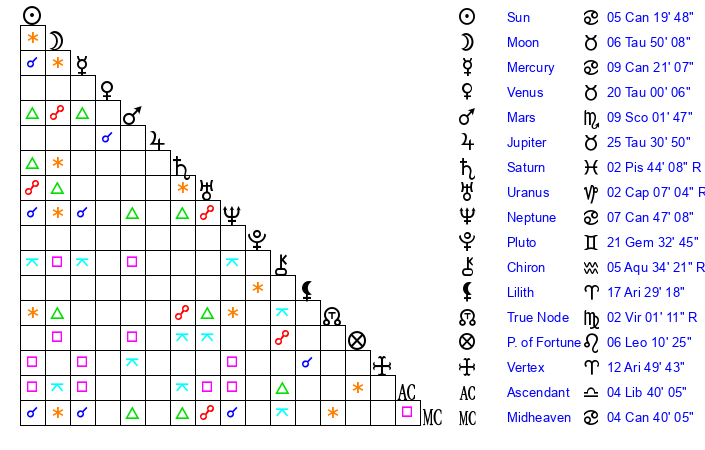| Sun | 5 Cancer 20 | 6 Cancer 18 | 1 Scorpio 37 |