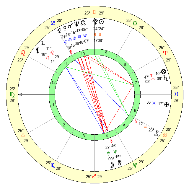 | Sun | 24 Gemini 9 | 24 Gemini 50 | 16 Libra 59 |