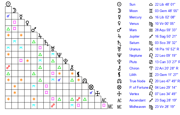 Moon | 3 Gemini 53 | 26 Leo 9 | 16 Aquarius 42 |