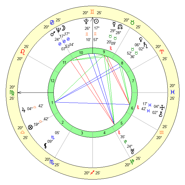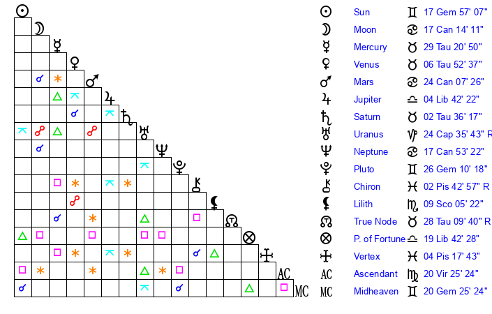 | Sun | 17 Gemini 57 | 19 Gemini 6 | 8 Libra 37 |