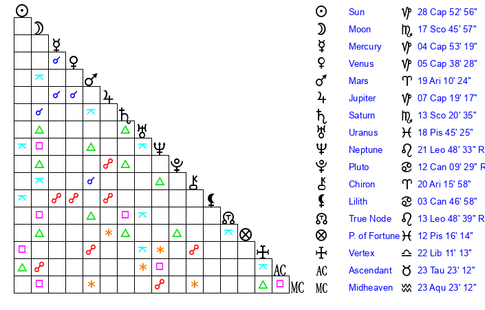 Neptune | 21 Leo 48 | 27 Pisces 38 | 19 Leo 47 |