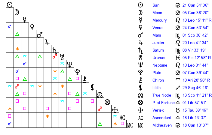 Sun | 21 Cancer 54 | 22 Cancer 30 | 3 Scorpio 59 |